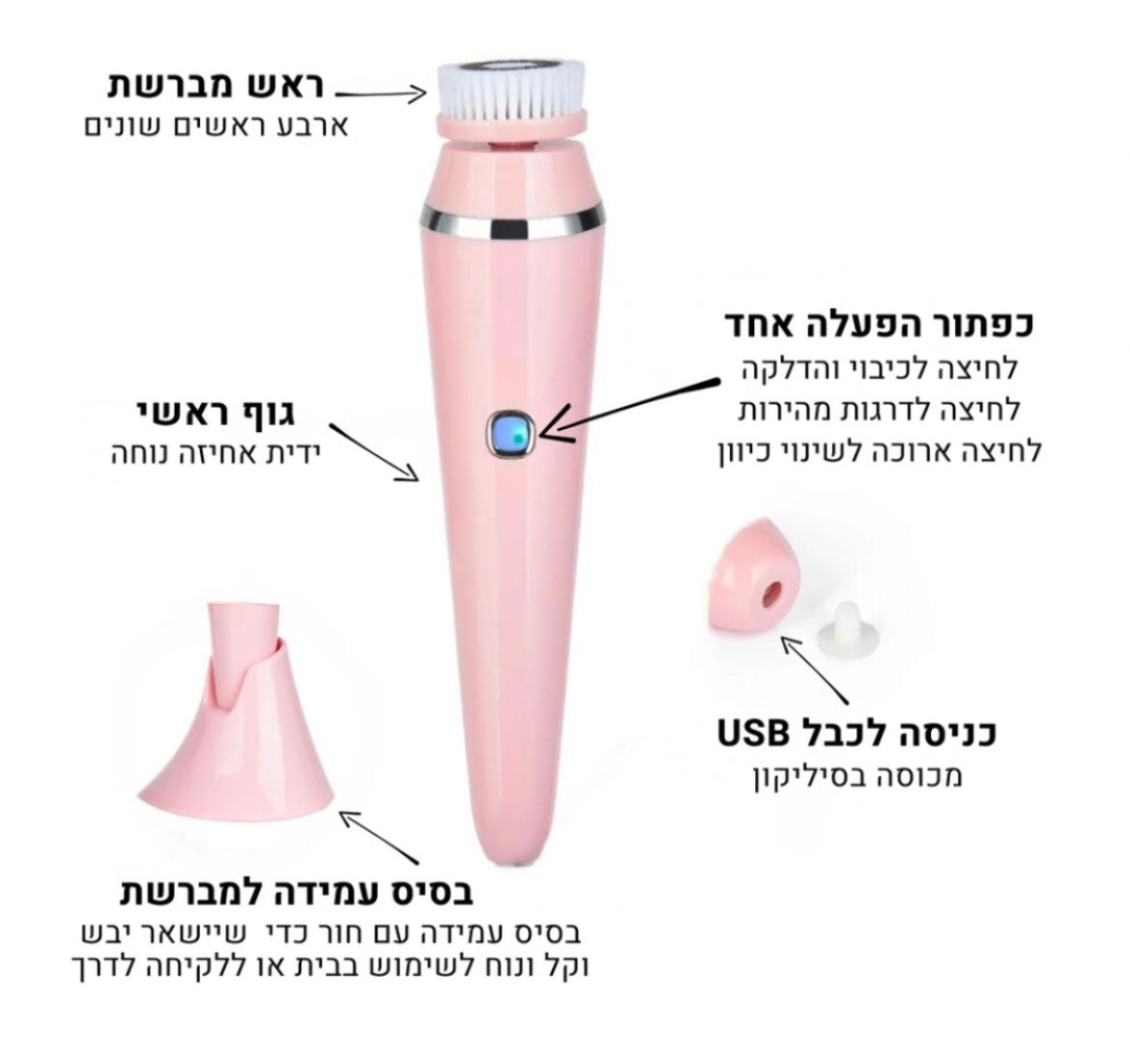 למברשת הפנים יש 4 ראשים שונים שכל אחד מהם אחראי לחלק אחר בשגרת הטיפוח!